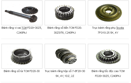 Chúng tôi cung cấp bánh răng hộp số xe nâng các loại Toyota, Komatsu, TCM , Mitsubishi, Jungheinrich, BT, Crown, Raymond, Hyster, Yale, Hyundai, Linde, Clark…xin quý khách vui lòng thông báo model xe và model động cơ chúng tôi có thể cung cấp tất cả các loại phụ tùng của tất cả các hãng