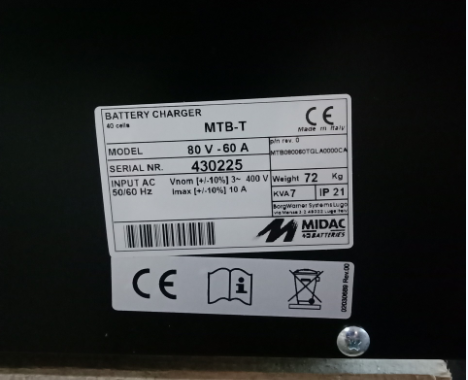 | Tên sản phẩm | Bộ sạc ắc quy xe nâng hiệu MIDATRON loại 80- 60T (80V 60A), hàng mới 100% |