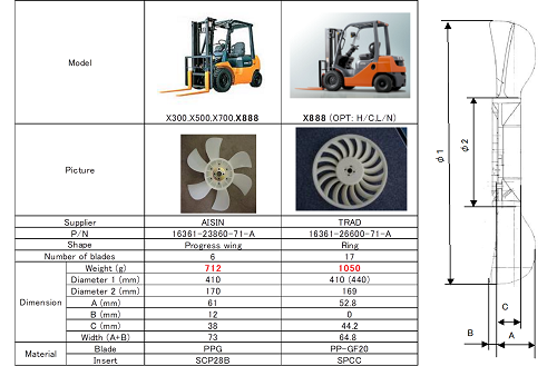 - Thông số kỹ thuật quạt làm mát sử dụng cho từng dòng xe