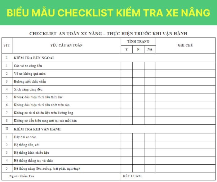 Biểu mẫu checklist kiểm tra xe nâng