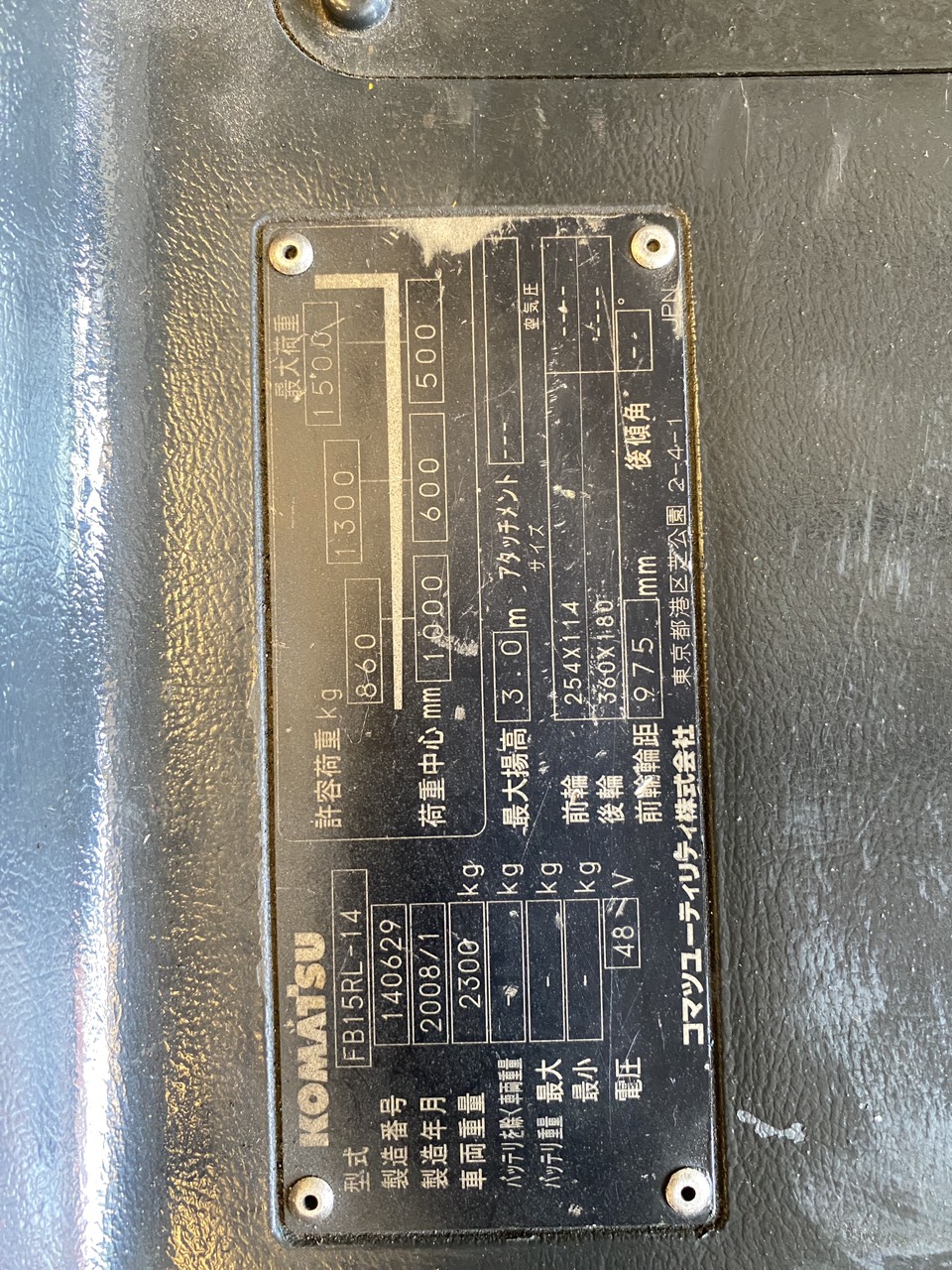 Model: FB15RL-14 Hãng sản xuất: Komatsu Số khung: 140629 Tải trọng nâng: 1500kg Chiều cao nâng: V3000mm Bánh PU Năm sản xuất: 2008 Hàng chưa qua sử dụng tại Việt Nam Nhập chính ngạch từ Nhật Bản- Giấy tờ đầy đủ |