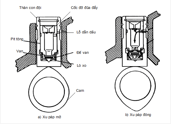 Xu páp đóng: Khi cam thôi tác dụng vào con đội, dưới tác dụng của lò xo, thân con đội và pit tông bị đẩy về hai phía, áp suất dưới pit tông giảm, van bi mở ra, do đó dầu từ đường dầu chính của hệ thống bôi trơn qua đường dẫn dầu trên thân máy vào khoang dầu phía dưới pit tông.