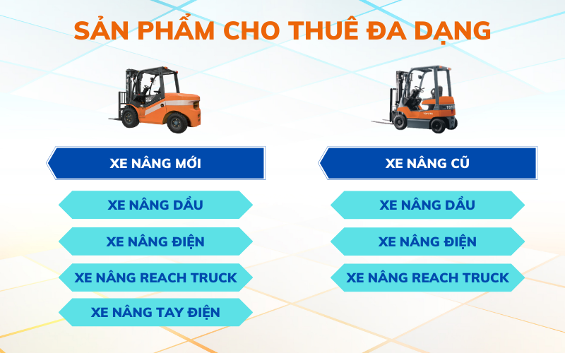 Khách hàng có thể lựa chọn xe nâng mới hoặc xe nâng cũ với nhiều dòng xe khác nhau để phù hợp với môi trường làm việc của quý doanh nghiệp.