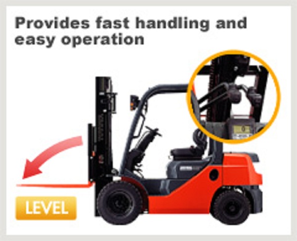 Với người mới lái, tài xế dễ dàng thao tác vào và ra pallet khi chỉ cần ấn 1 nút bấm vào cần điều khiển, càng xe sẽ tự động song song với mặt đất, tài xế ko thể đâm thủng hàng hay pallet được. Với tài xế lâu năm, thao tác này giúp tài xế điều khiển mượt mà một cách hoàn hảo. Công nghệ độc quyền chỉ có ở trên xe nâng Toyota