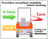 Với xe Toyota forklift battery - xe nâng điện 3 bánh, hệ thống xy lanh chống lật ở trục cầu sau được thay thế bằng tính năng tự giảm tốc khi vào cua, máy tính sẽ tính toán chính xác tốc độ an toàn và cho phép vận hành khi tài xế đánh lái mạnh ở tại các tốc độ cao quá mức cho phép