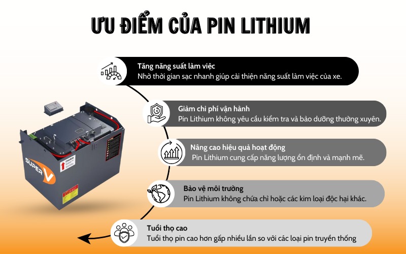 Pin lithium cho xe nâng cho phép sạc nhanh trong thời gian ngắn và không cần nghỉ sau sạc. Người vận hành có thể cắm sạc trong giờ nghỉ mà không ảnh hưởng tuổi thọ pin.