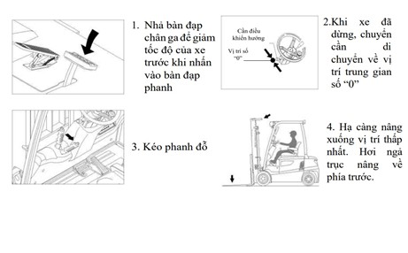 Để dừng xe an toàn, người vận hành cần giảm tốc từ từ, hạ càng cho đến khi tiếp xúc mặt sàn, đưa cần điều khiển về vị trí trung tính và kéo phanh tay. Sau đó, tắt máy và khóa chìa, đảm bảo xe được đặt tại vị trí đúng quy định.