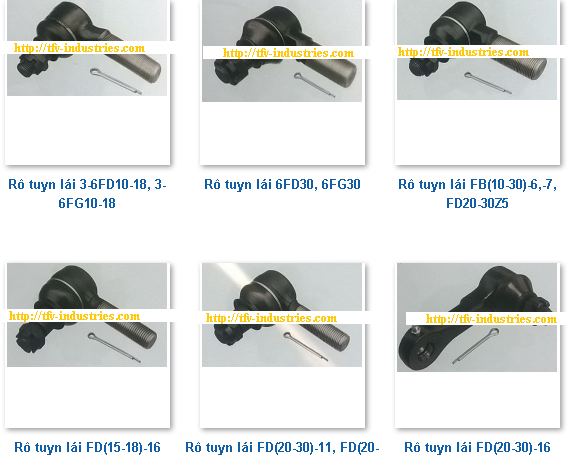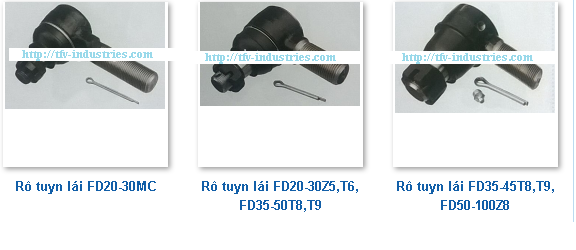 Chúng tôi cung cấp Rotuyn lái xe nâng các loại Toyota, Komatsu, TCM , Mitsubishi, Jungheinrich, BT, Crown, Raymond, Hyster, Yale, Hyundai, Linde, Clark…xin quý khách vui lòng thông báo model xe và model động cơ chúng tôi có thể cung cấp tất cả các loại phụ tùng của tất cả các hãng