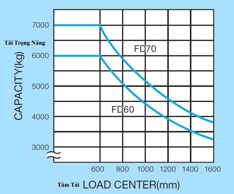 Ví dụ: 2.000 kg tại tâm tải 500 mm nghĩa là xe chỉ đảm bảo nâng an toàn 2.000 kg khi tâm tải không vượt quá 500 mm.