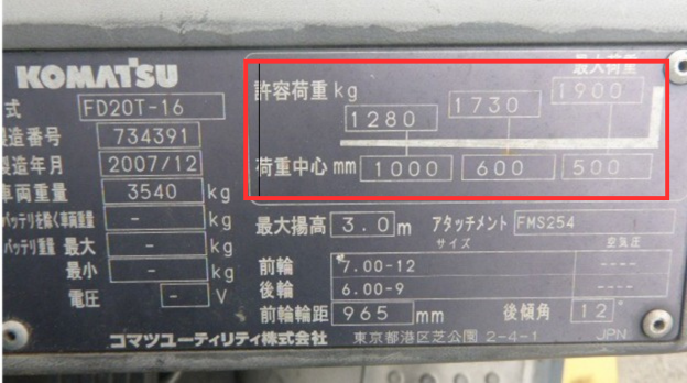 Trên mỗi xe nâng đều có biển thông số thể hiện tải trọng định mức tại tâm tải tiêu chuẩn.