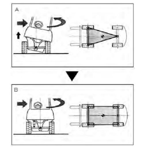 Hình A cho thấy tình trạng xe với bộ ổn định phía sau điều khiển tích cực được đặt thành TẮT. Lốp xe ở cả hai đầu của trục sau xoay theo phương thẳng đứng với điểm tựa ở chốt giữa nằm ở tâm của trục sau. Do đó, phương tiện được hỗ trợ bởi ba điểm như thể hiện trong hình. Xe nâng trong tình trạng ổn định trong khi trọng tâm của nó nằm trong tam giác nối ba điểm này.