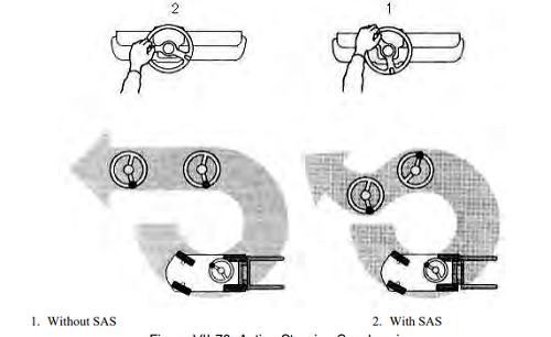 Một cảm biến được sử dụng để phát hiện khoảng cách giữa góc vô lăng và góc lốp, và nó được điều chỉnh bằng cách sử dụng van điện từ. Điều này luôn giữ cho núm xoay ở vị trí hiển thị bên dưới (9 giờ) trong khi lốp xe được đặt thẳng, dẫn đến khả năng hoạt động được cải thiện đáng kể.