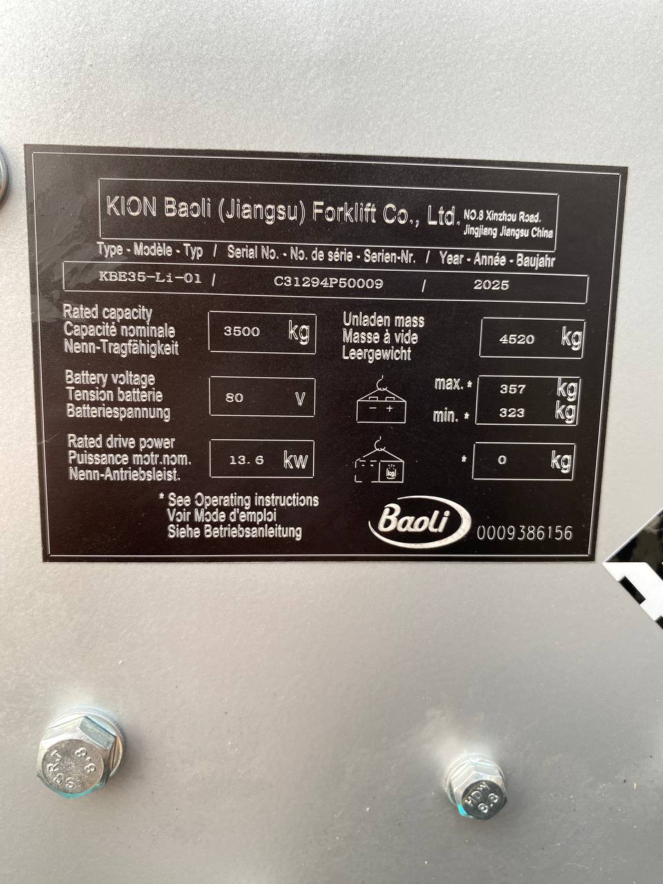 - Hãng sản xuất: KION - Thương hiệu: Baoli - Tải trọng nâng: 3500kg - Số khung: C31294P50009 - Chiều cao nâng: 4500mm - Lốp hơi - Càng 1200mm - Pin LTU 76.8V412Ah - Sạc 80V200A - Năm sản xuất: 2025 - Hàng mới 100% |