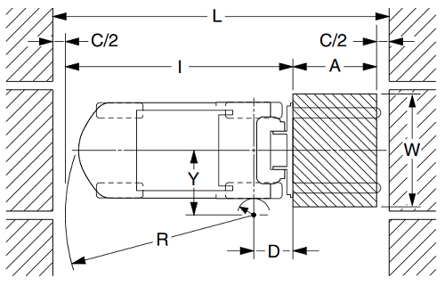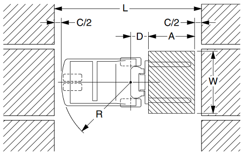 Do đó loại bỏ mức độ liên quan của chiều rộng lối đi xếp chồng góc phải. Đối với xe nâng 4 bánh, xe nâng 3 bánh, giá trị này được cho là chiều rộng lối đi xếp chồng góc phải, vì vậy khi tính toán thì hãy thêm một khoảng trống và đặt nó là 1 giá trị C.