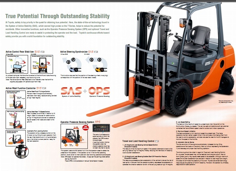 SAS – System of Active Stability là công nghệ cân bằng chủ động giúp tự động điều chỉnh góc nghiêng cột nâng khi xe di chuyển hoặc quay gấp. Điều này hạn chế tối đa nguy cơ lật xe và đổ hàng.