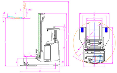 Hiệu quả: Xe nâng này đi vào làn đường dài tới 10.000mm để lấy vật liệu. Chiều dài lối đi cần thiết giảm 1/3 so với xe nâng di chuyển về phía trước thông thường, cho phép tăng gấp đôi dung lượng lưu trữ vật liệu trong kho.