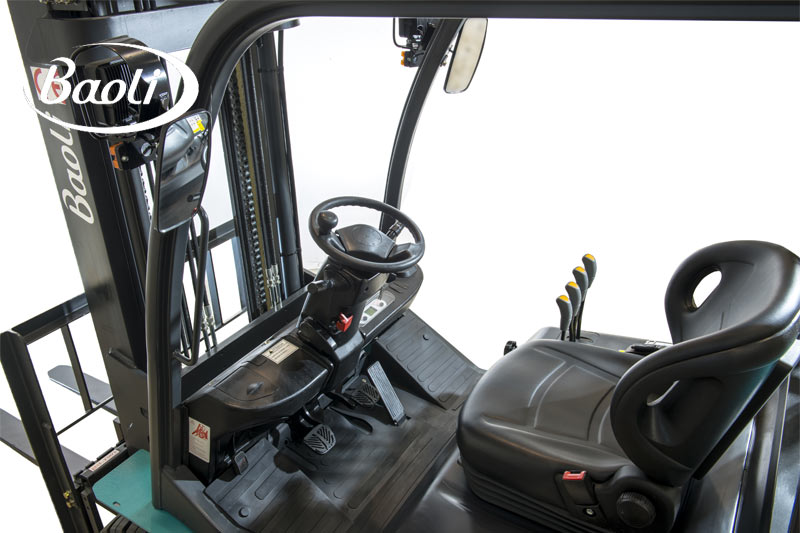 Khoang lái của Baoli KBD35 được thiết kế theo triết lý Ergonomic Design, đặt sự thoải mái của người lái làm trung tâm. Tay điều khiển bên hông Side Operation Lever giúp người vận hành dễ dàng thao tác mà không phải nghiêng người. Vô-lăng mô-men xoắn thấp (Low Torque Steering) hỗ trợ điều khiển nhẹ nhàng, chính xác. Bệ điều khiển có màn hình LCD hiển thị đa thông tin, cung cấp dữ liệu hoạt động, cảnh báo nhiệt độ và tình trạng dầu động cơ theo thời gian thực. Hệ thống giảm rung cabin bằng 4 đệm cao su (Cushion Gasket) giúp người lái giảm mỏi và tăng độ tập trung trong ca làm việc dài. Đặc biệt, xe nâng dầu Baoli 3.5 tấn được trang bị tay vịn sau có còi cảnh báo (Rear Grip with Horn) – chi tiết nhỏ nhưng cực kỳ quan trọng khi lùi xe trong khu vực đông công nhân.