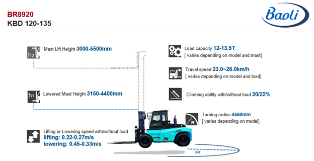 Xe nâng dầu Baoli KBD135 thuộc nhóm KBD120–135 Series, dòng xe nâng tải nặng của Baoli với cấu trúc khung gầm hạng nặng, động cơ diesel công nghiệp mạnh mẽ và hệ thống truyền động Power Shift tiên tiến.