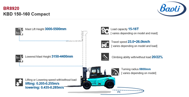 Nhờ động cơ công nghiệp Yuchai/Weichai mạnh mẽ, khung gầm thép chịu lực cao và thiết kế tối ưu trọng tâm, dòng Baoli KBD150 mang lại hiệu suất vượt trội khi làm việc trong kho bãi, nhà máy thép hoặc cảng container.