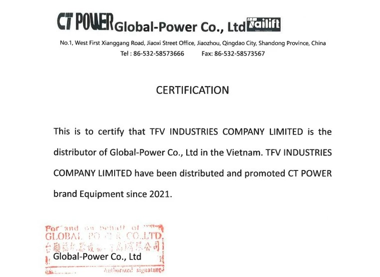 Công ty TFV với cam kết mang đến chất lượng vượt trội và sự hài lòng cho khách hàng đã khẳng định vị thế là nhà cung cấp giải pháp công nghiệp hàng đầu tại Việt Nam. Bằng việc hợp tác với thương hiệu CT Power, TFV tiếp tục thực hiện sứ mệnh cung cấp các dịch vụ xe nâng hàng cao cấp và phù hợp với nhu cầu cụ thể của các doanh nghiệp Việt.