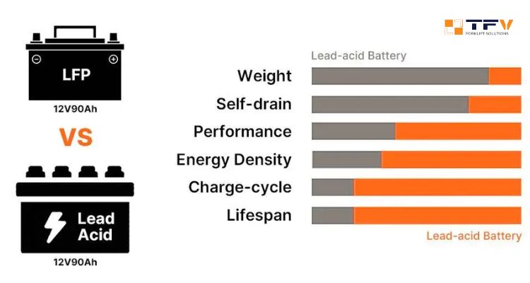 | Trọng lượng pin (Weight) | Nhẹ hơn 40–60% | Nặng hơn | Giúp xe tiết kiệm điện, tăng tốc nhanh hơn, phù hợp với mô hình kho hẹp. |