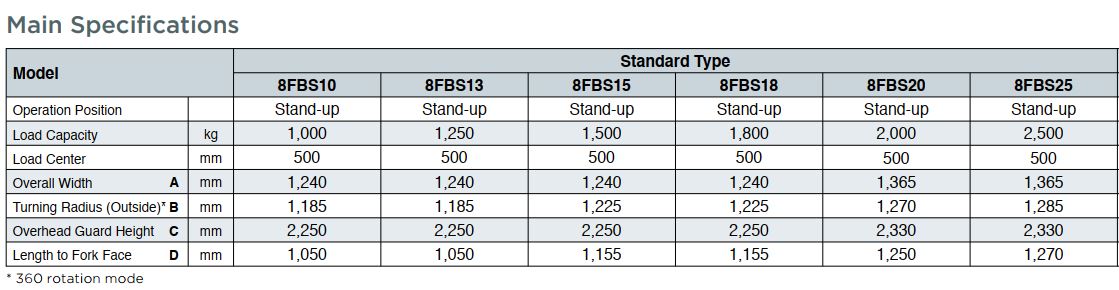 Dòng Toyota 8FBS10 nằm trong các model từ 8FBS10 đến 8FBS25, có tải trọng từ 1.0 đến 2.5 tấn, sử dụng nguồn điện 48V và động cơ AC hiệu suất cao.