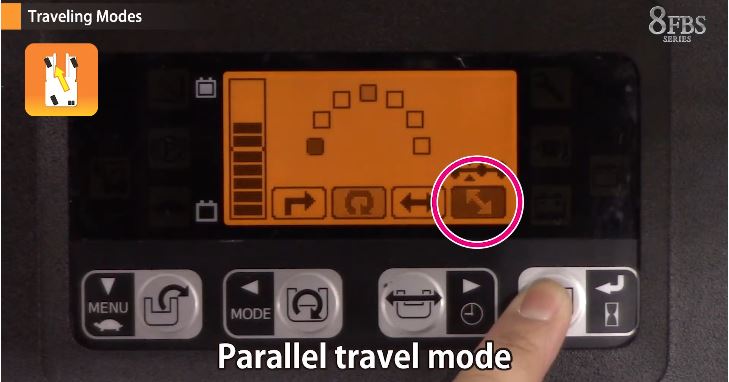 Parallel Travel Mode: xe di chuyển song song với kệ hàng, phù hợp khi cần tiến – lùi dọc lối hẹp.