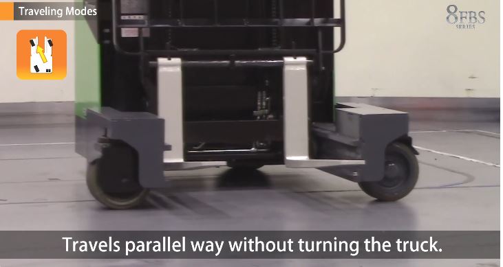 Sideways Travel Mode: xe di chuyển ngang trái – ngang phải, rất tiện khi vận chuyển hàng dài như thép hộp, ống nhựa hoặc tấm gỗ công nghiệp.