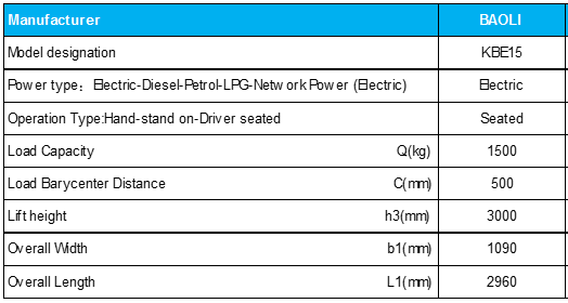 Xe nâng điện 1.5 tấn hiệu KION BAOLI KBE15. Linh kiện đến từ châu Âu. Có khả năng nâng trọng lượng tới 1500kg và nâng cao 3000mm, tích hợp nhiều công nghệ hiện đại, tiến tiến, sử dụng nhiên liệu sạch thân thiện với môi trường.