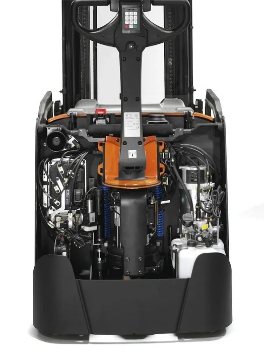 Thiết kế mở (Easy access for maintenance) giúp kỹ thuật viên dễ dàng tiếp cận các bộ phận chính như bộ điều khiển AC, mô-tơ nâng và cụm thủy lực.