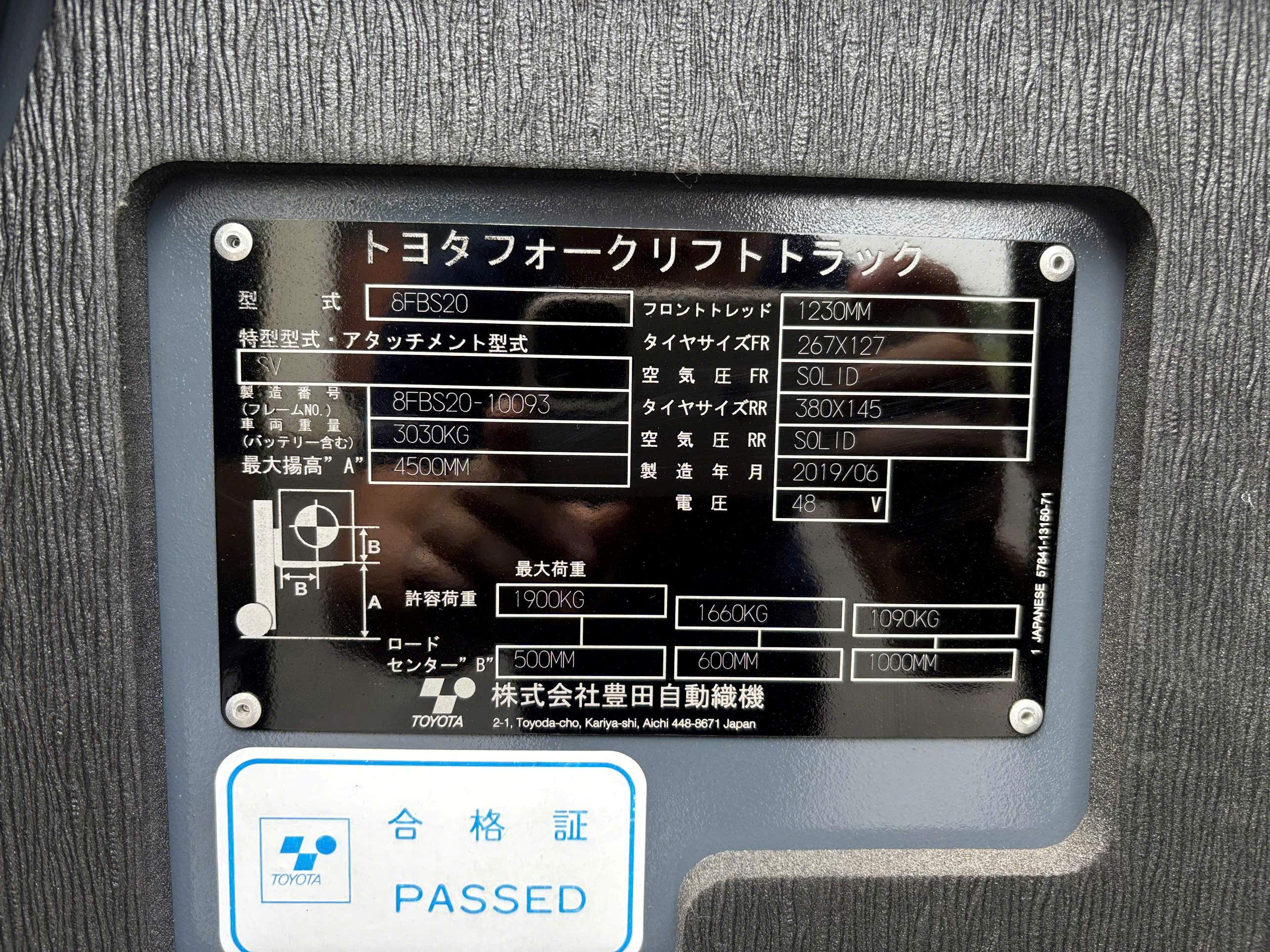 Xe nâng điện cũ đứng lái 2 tấn Toyota 8FBS20, nâng cao 4.5m, sx 2019