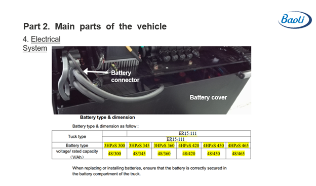 Baoli ER15-111 được trang bị ắc quy chì 48 V/300 Ah tiêu chuẩn, có thể nâng cấp lên 420 Ah cho ca làm việc dài hơn.