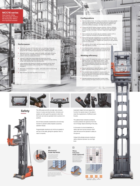 Dòng MCC Series sử dụng pin Lithium 80V/450–600Ah, hệ thống điều khiển Curtis AC, và cơ cấu xoay càng 180° cho phép thao tác xếp dỡ hàng hóa từ cả hai bên mà không cần quay thân xe. Phiên bản MCC16-U và MCC12 được trang bị hệ thống lái điện tử EPS, phanh tái sinh, và màn hình LCD đa chức năng, đảm bảo vận hành mượt mà, tiết kiệm năng lượng và an toàn tuyệt đối.
