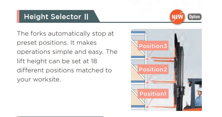 Height Selector II: Cho phép cài đặt sẵn 18 vị trí chiều cao nâng, giúp xe tự động dừng đúng tầng kệ đã định – cực kỳ hữu ích trong kho tiêu chuẩn.