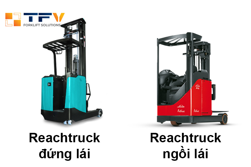 Về cơ bản, cả reachtruck đứng lái và reachtruck ngồi lái đề sở hữu cơ cấu vươn khung giúp càng nâng có thể đưa pallet vào sâu trong kệ hàng mà không cần xe tiến sát vào kệ. Reach Truck đứng lái được thiết kế nhằm tối ưu hóa khả năng vận hành trong lối đi hẹp (narrow aisle warehouse). Cabin nhỏ gọn giúp xe có bán kính quay nhỏ hơn, cho phép di chuyển linh hoạt giữa các dãy kệ hàng sát nhau. Ngược lại, Reach Truck ngồi lái được thiết kế với mục tiêu nâng cao sự thoải mái cho người vận hành. Cabin rộng hơn, ghế ngồi có hệ thống giảm chấn và bố trí điều khiển công thái học giúp người lái có thể vận hành trong thời gian dài mà ít bị mệt mỏi.