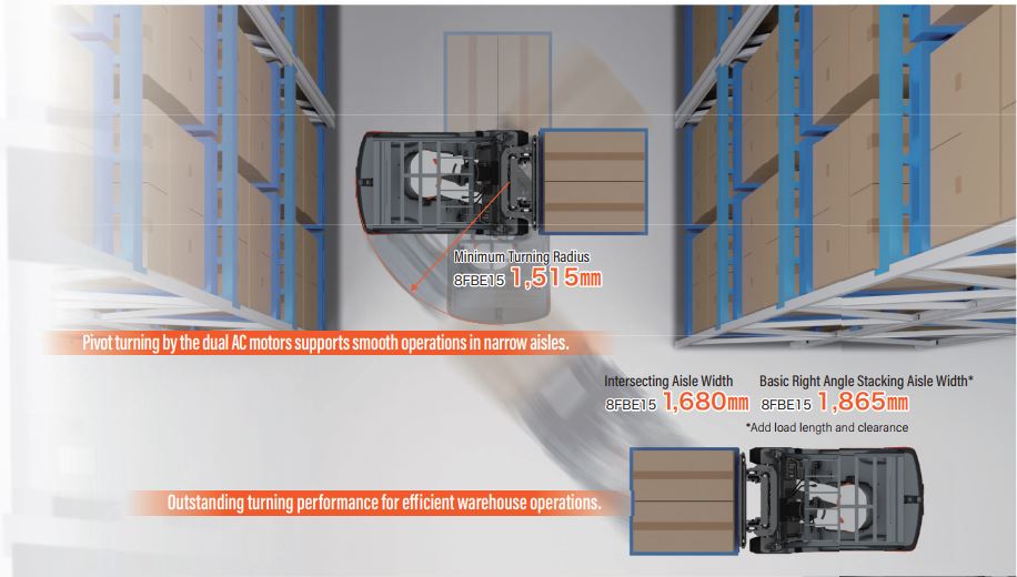 Toyota 8FBE Series được tối ưu hóa cho các môi trường làm việc yêu cầu bán kính quay nhỏ, chẳng hạn như kho hàng, khu vực logistics, nhà máy chế biến thực phẩm hay xưởng lắp ráp linh kiện điện tử.