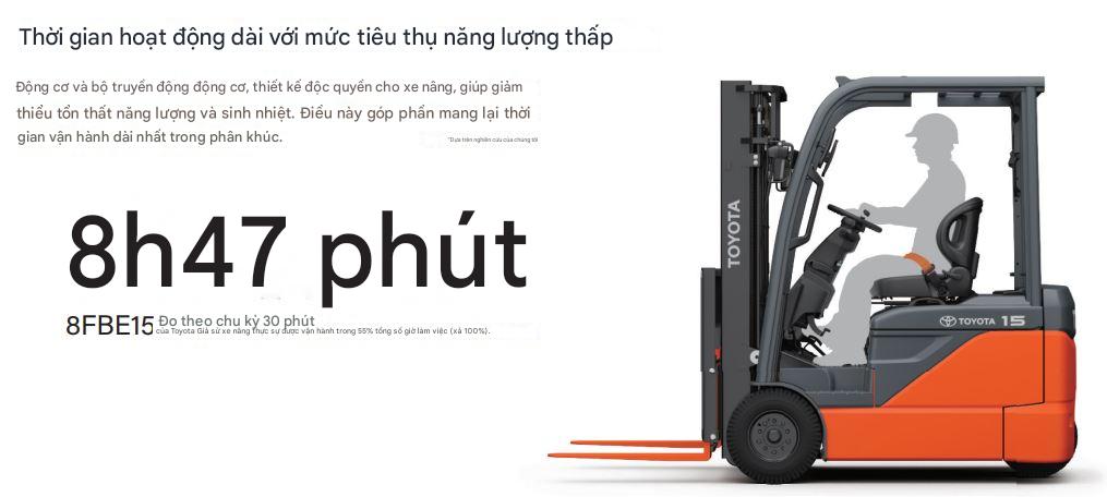 Theo tiêu chuẩn thử nghiệm VDI, mức tiêu thụ điện trung bình chỉ 3.4 – 4.3 kWh/h, cho phép xe hoạt động liên tục 8–10 giờ mỗi ca mà không cần sạc thêm.