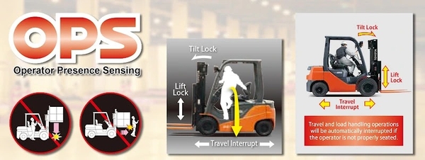 Hệ thống OPS hoạt động thông qua cảm biến trọng lực dưới ghế lái. Khi người vận hành rời ghế, hệ thống sẽ ngắt mạch điều khiển nâng, nghiêng và lái. Điều này loại bỏ nguy cơ xe tự di chuyển khi không có người điều khiển – một trong những nguyên nhân chính gây tai nạn trong kho.