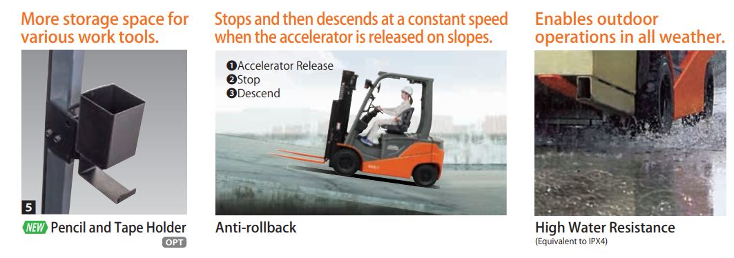 Động cơ điện AC của 8FBN Series hoạt động mạnh mẽ nhưng vẫn êm ái và tiết kiệm. Xe được trang bị: