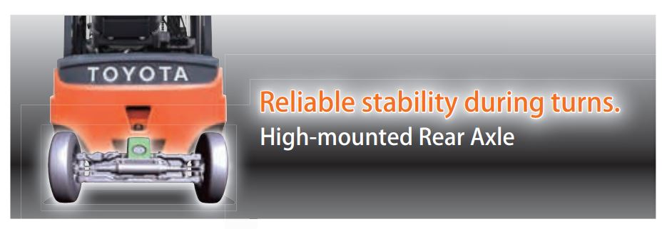 Toyota 8FBN Series được phát triển trên nền khung thép liền khối, chịu lực tốt và chống xoắn hiệu quả. Trục sau High-Mounted Rear Axle được thiết kế đặt cao hơn trục trung tâm, giúp hạ thấp trọng tâm tổng thể, từ đó nâng cao độ ổn định khi xe di chuyển hoặc quay đầu gấp.