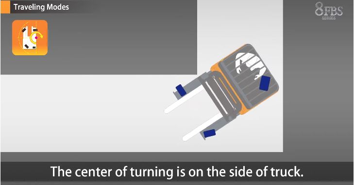 Khác với xe nâng điện thông thường, xe nâng điện Toyota 8FBS25 có thể di chuyển ngang và xoay tròn quanh tâm nhờ hệ thống 4-Way Travel Control System.