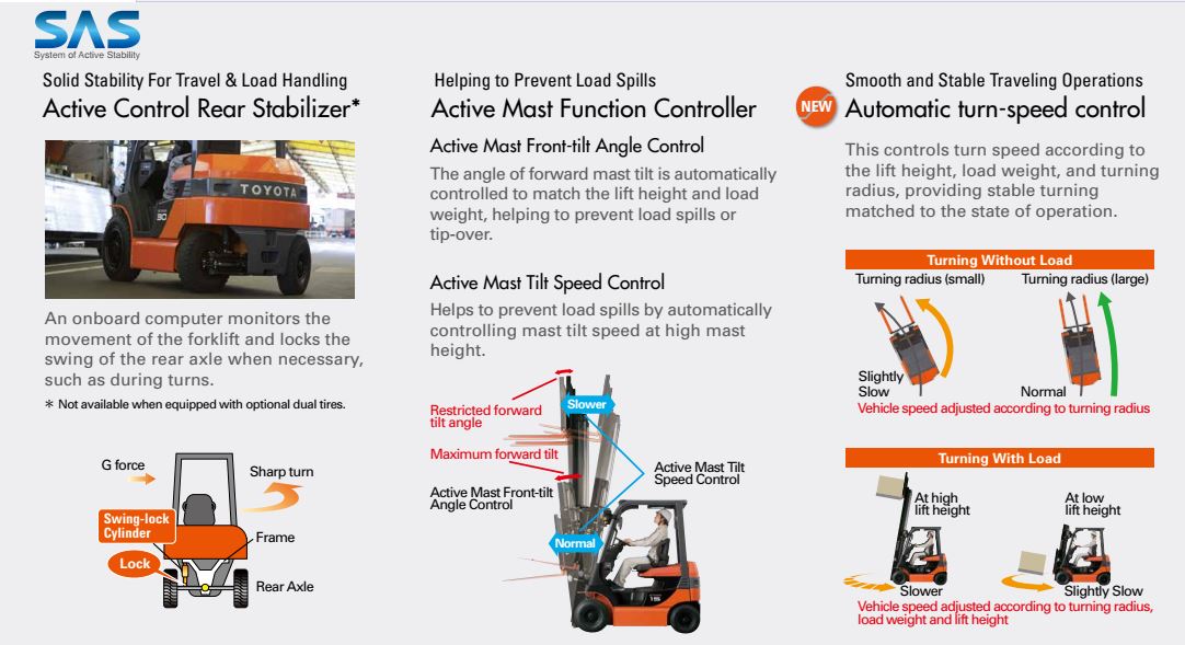 Công nghệ System of Active Stability – Reach Type giám sát mọi chuyển động, tự động can thiệp khi xe vào cua hoặc nâng cao tải.