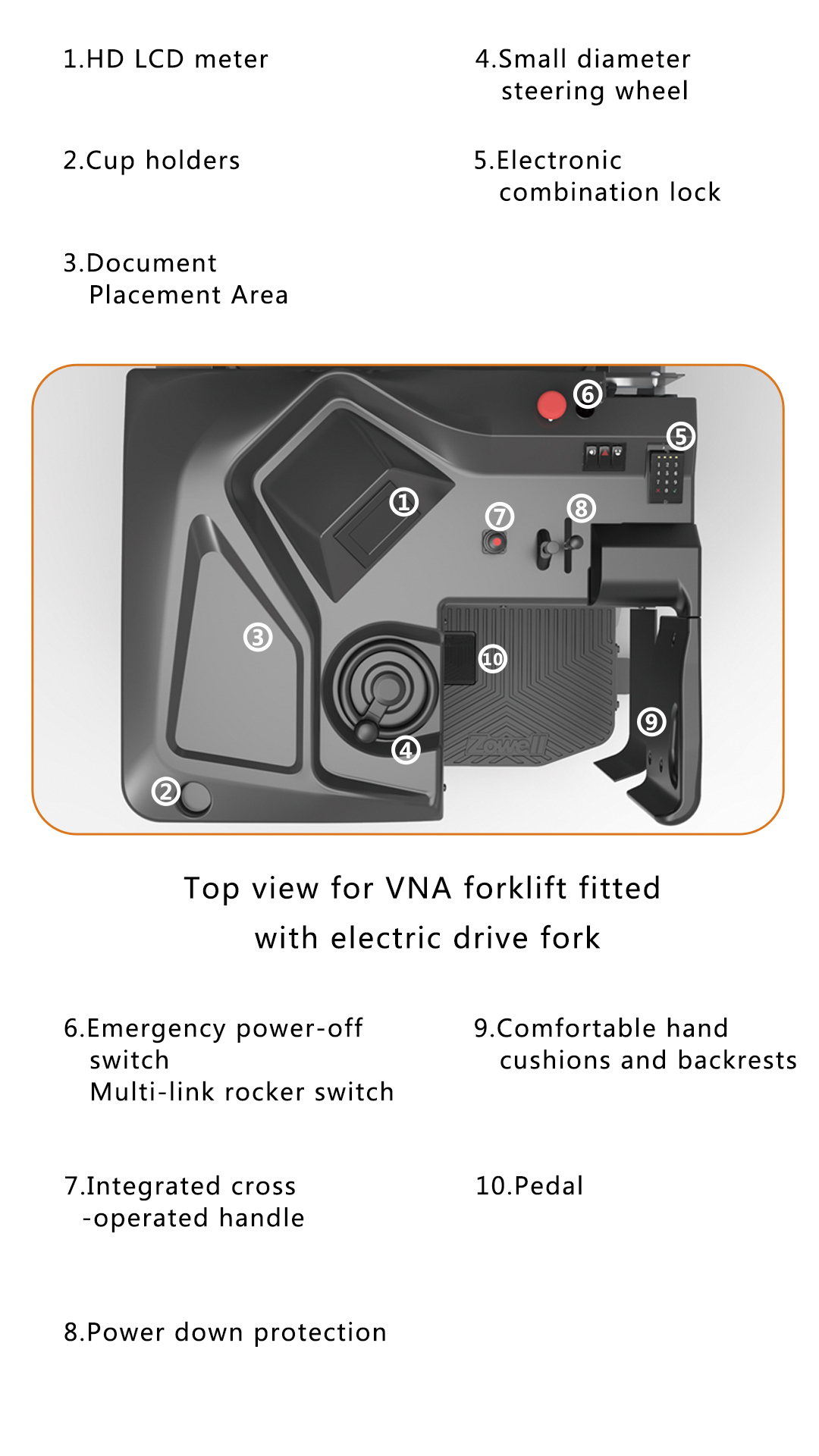 Xe nâng lối đi hẹp đa năng ba bên Zowell VDA Series tối đa hóa việc sử dụng không gian nhà kho. So với xe nâng thông thường, chỉ cần khoảng cách từ ray đến ray là 1580 mm để cho phép bạn vận hành xe dễ dàng trong không gian có chiều rộng lối đi hẹp, thuận tiện cho bạn di chuyển hàng hóa theo chiều ngang dưới sự hỗ trợ của phuộc xoay 180 độ.