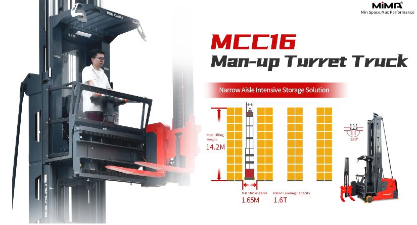Xe nâng điện VNA Man-up MCC16 thuộc dòng MCC Series (Man-up Cabin) của MIMA Forklift, là thế hệ xe nâng 3 chiều (3-way pallet stacker) tiên tiến được thiết kế chuyên biệt cho kho hàng cao tầng, kho lạnh, kho dược phẩm và trung tâm logistics hiện đại. Trong xu hướng chuyển đổi sang kho thông minh và tối ưu không gian lưu trữ, MCC16 trở thành giải pháp lý tưởng khi kết hợp hiệu suất, độ chính xác và an toàn vận hành vượt trội trong không gian cực kỳ hạn chế.