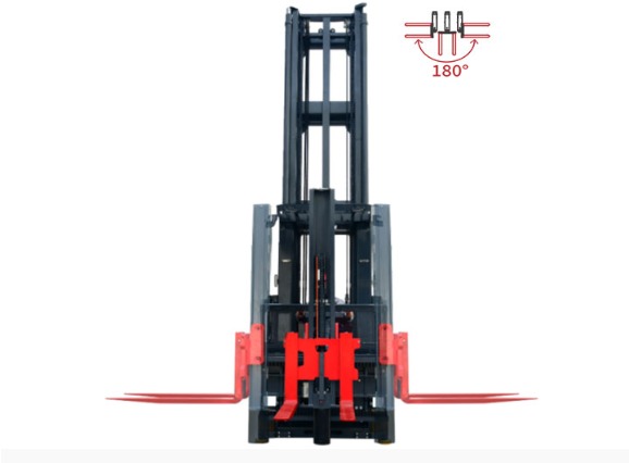Cụm càng xoay 3 chiều (Three-way Fork System) cho phép xe lấy hàng song song hoặc vuông góc kệ mà không cần xoay thân xe – yếu tố cực kỳ quan trọng trong kho hẹp.