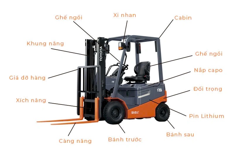 Khung xe chịu lực chính, còn hệ thống nâng gồm trụ nâng, xích và càng nâng giúp giữ và nâng tải.