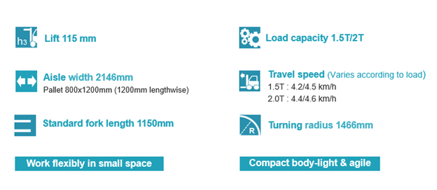 Với thiết kế gọn gàng, pin linh hoạt, motor AC bền bỉ và tính năng an toàn đạt chuẩn châu Âu, dòng xe này đáp ứng tốt cả nhu cầu xếp dỡ hàng nhẹ trong kho hẹp lẫn ứng dụng vận chuyển liên tục trong dây chuyền sản xuất.