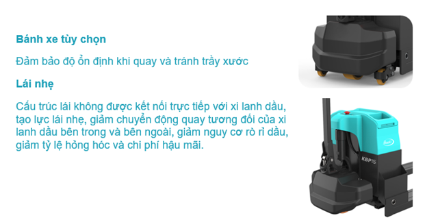 Với tải trọng nâng 2 tấn, thiết kế thân xe nhỏ gọn và pin lithium tùy chọn, dòng xe KBP20-A phù hợp cho các kho hàng vừa và nhỏ, nhà máy sản xuất, siêu thị, hoặc khu vực bốc xếp container.
